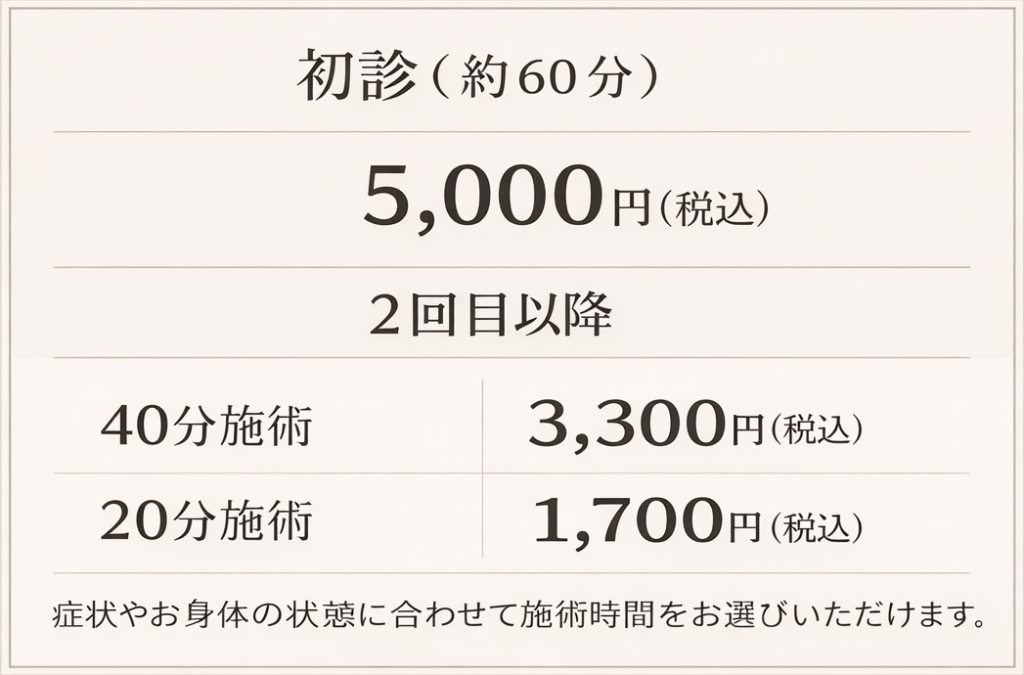 健康保険をご利用するか、痛みがある部位が何か所あるか、何分施術するか、ご負担割合によって異なります。